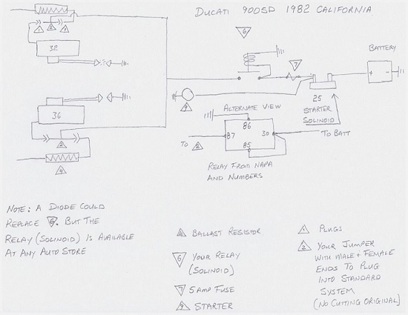 Mount the relay somewhere and connect the main wire from your relay to the relay to the Battery side of the starter relay with a 10 amp inline fuse. Connect a wire from the coil side of the starter relay (goes to the starter button)to the coil side of your new relay. If your relay needs a coil ground, supply one to it.Pay attention to the starter button polarity. If the starter button grounds the starter relay, make it ground your relay. ( I will double check this and edit a correction later) (your new relay will now close when you press the start button). With an appropriate collection of connectors, you now make up a harness to supply power to the coil side of the Ballast Resistors. You can chop/splice the original loom if you wish. I chose not to.