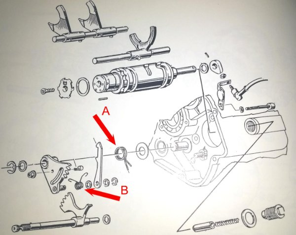 The other contributory factor might be a weakening of one/other/both of the two return springs - see the scan of the parts book below. The return spring of the gear lever itself (A) is a well-known weak point - had them fail on both my MHR and my SSD. The photo shows how knackered they can become. Eventually, the spring snaps.