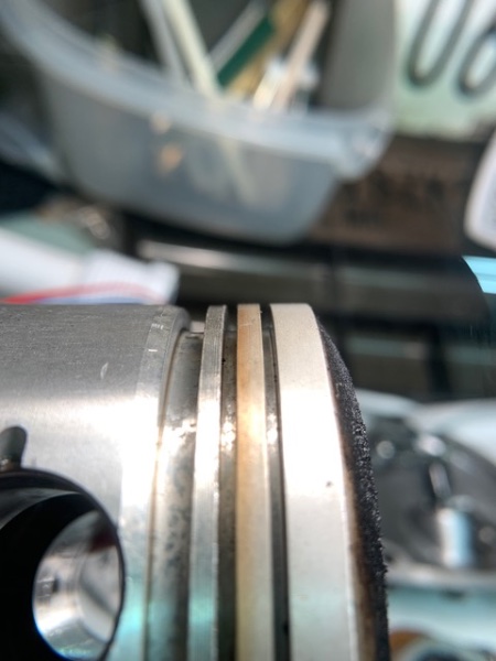 My spark plug on the horizontal cylinder was fouling a bit on my relatively new to me 750GT. I pulled the heads and cylinders and found a couple of things. Oddly the second ring on the horizontal cylinder was sticking in the land a bit forward of the wrist pin boss. The ring also has a chip out of it at the gap. The rig does not want to slide through at this point but I don't see any obvious deformation to cause this. The bike has 18,000 miles and the pistons and cylinders look great and are well within spec with a clearance of 0.06mm. I'm going to try new rings and see if I can open up the land in the tight spot with some light sanding or filing with an ignition file maybe?