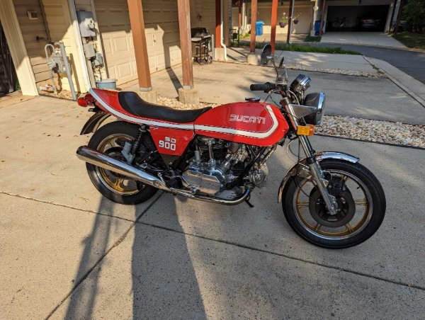 I've only been riding on the street since 2018, but also have a 2006 S2R800 (my first street bike, still my favorite daily) and a 2013 Streetfighter 848. I've done the usual things like valves, belts, fork rebuilds, and electrical work on both of those, but the bevel driven cams and even just 4 stroke carburetors are a new experience for me. I'm embarrassed to say I only knew some basics around the early desmo Ducatis and looked at the few recent 900SD auctions I could find to see what it seemed like they were going for, so I really didn't have much criteria beyond "900SD, good condition, reasonable price". The previous owner had it for 43 years and had some paperwork and parts to go with it... it has some modifications, but seems to have come with most (all?) of the original bits. It also came with an unmarked black 2-into-1 exhaust system that the previous owner said he had installed, then immediately decided it was too loud and had the Silentiums put back on. I've had trouble finding anything on that exhaust system. I happened across a video on YouTube where a guy was starting a 900SSD that had an identical-looking exhaust... I asked him about it and he said his was also unmarked and was made by Nepoti Caracchi Racing, so maybe that's what it is!? Less than a month after picking up the bike I found some lightly scratched/dinged early ~1980 Contis on eBay and the seller said they came off a Darmah he used to own. They basically just needed a little touch up sanding of isolated scratches and then general clean up and polishing to make them hold up to anything but a very close inspection, so they seemed a steal at $500.