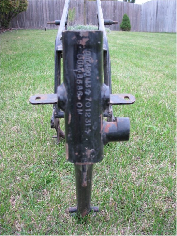 The headstock is stamped with a serial number (701231) and "DM450M3", and to the best of my knowledge the frame is completely straight and is unmolested, that is to say it has all the brackets for tool boxes, wiring hooks, a solid battery tray and the like.